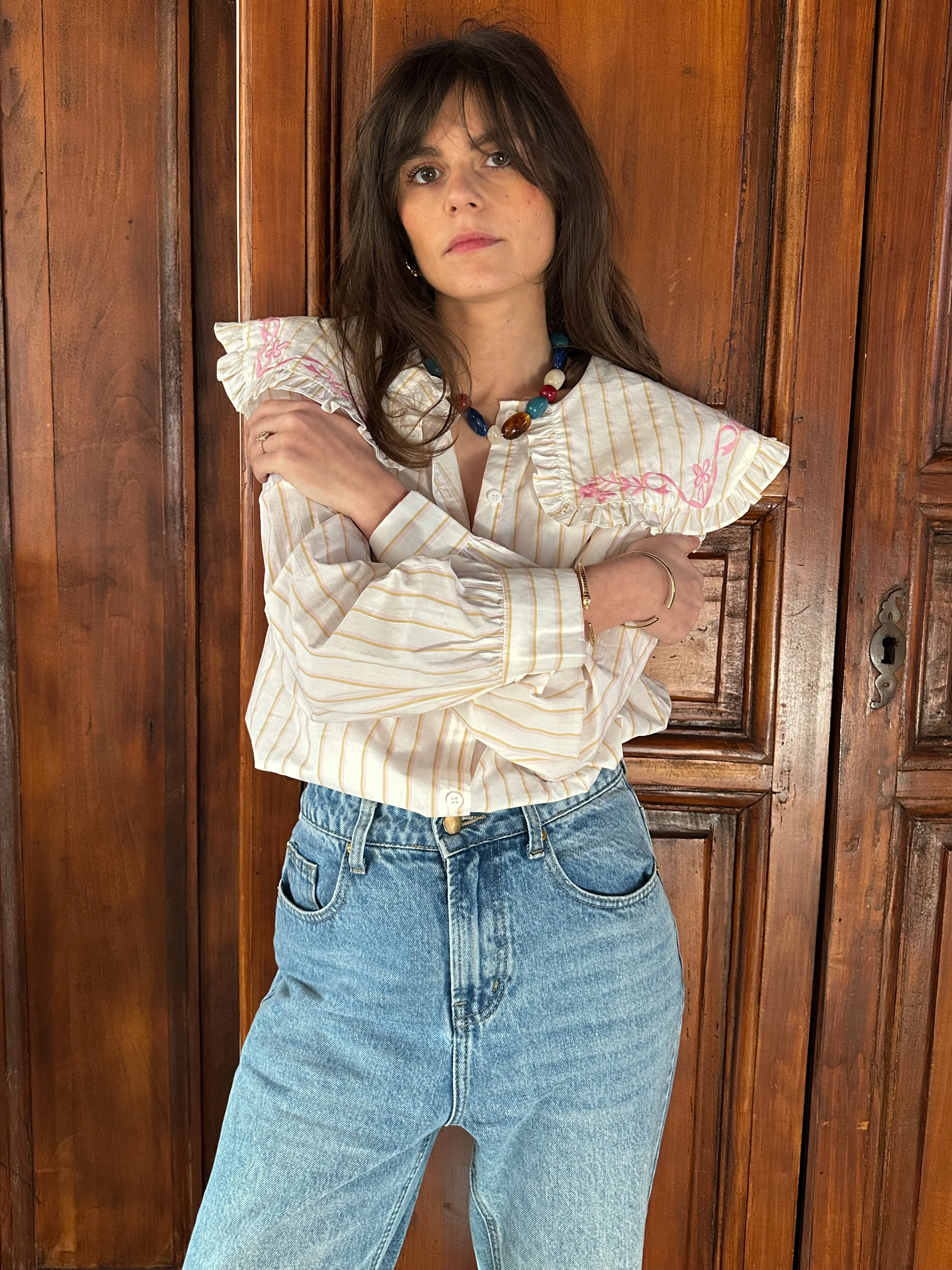 On oublie le col classique pour laisser place à un col Claudine XXL ultra-graphique de la blouse ALVIZE qui définira toute votre silhouette.