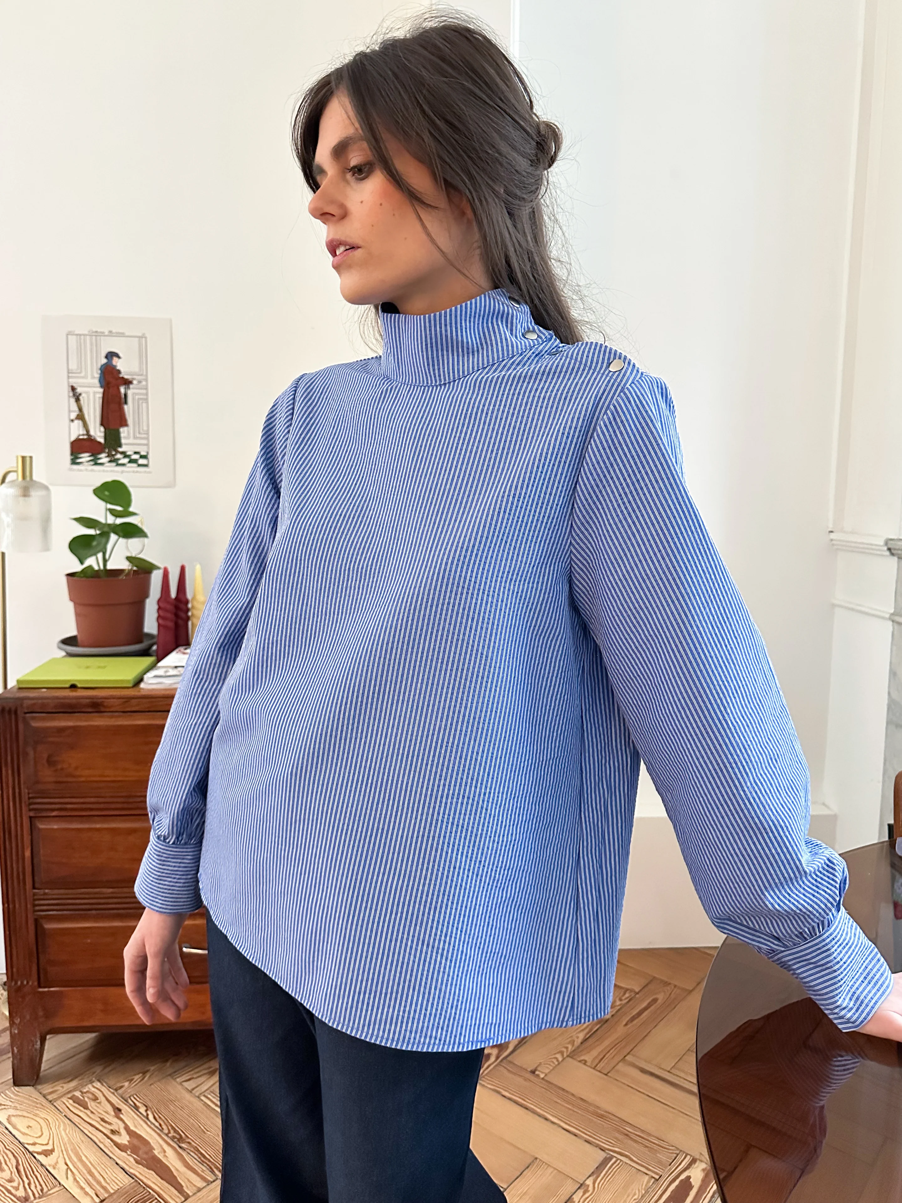 Incontournable du vestiaire, la blouse ROBINE réinvente la rayure classique avec une modernité irrésistible. Sa coupe originale se distingue par un col montant sophistiqué, sublimé par de délicates pressions métalliques sur l'épaule qui lui confèrent un caractère unique. Une pièce chic et structurée qui apporte immédiatement de l'allure à votre tenue.