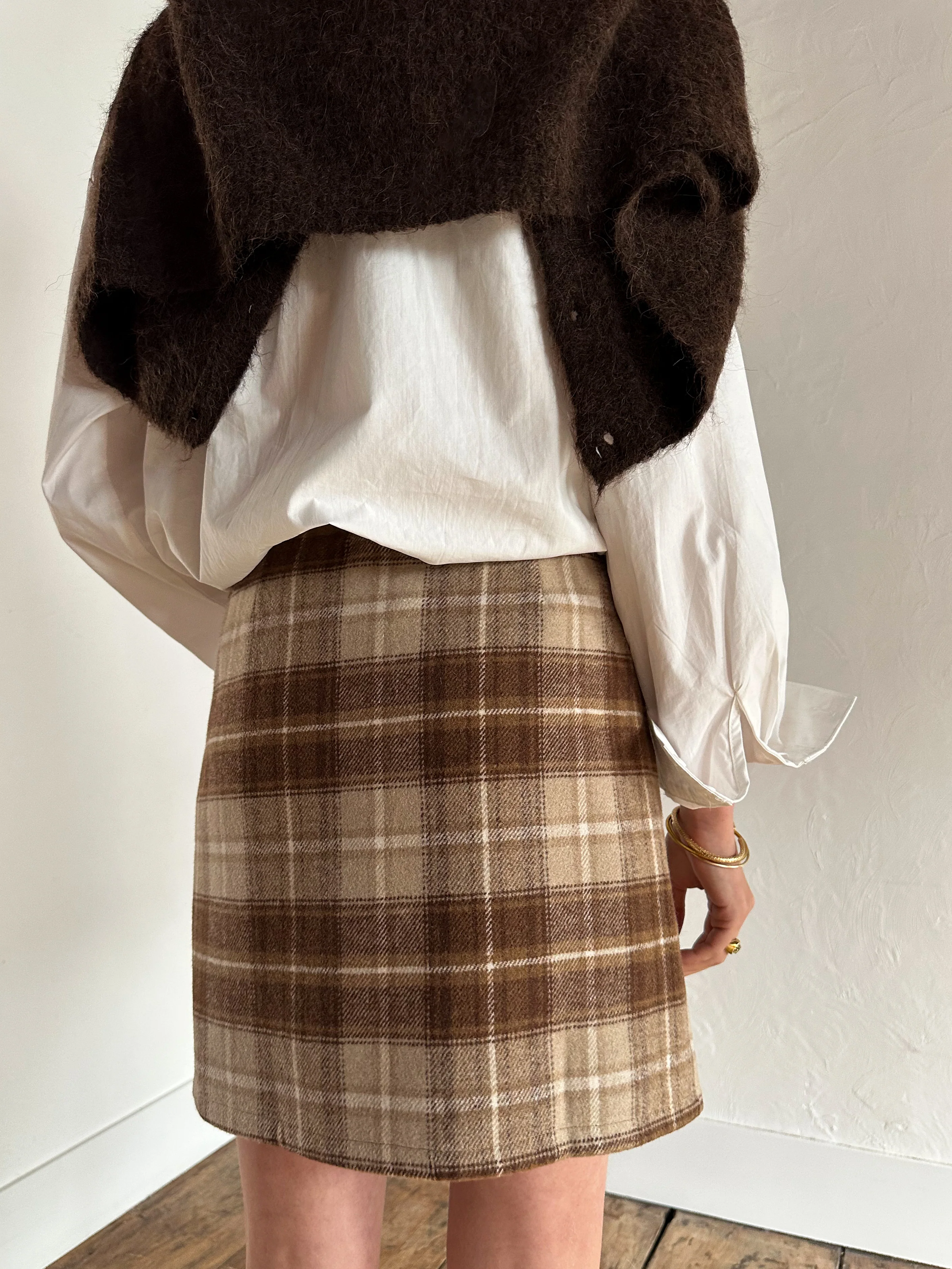 La jupe SWAN séduit par son allure rétro et son motif à carreaux dans des tons chauds de beige et de marron. Sa coupe droite met en valeur la silhouette tout en restant confortable au quotidien.