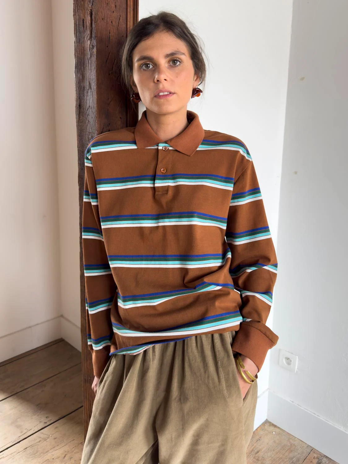- Polo camel à rayures bleues et vertes,