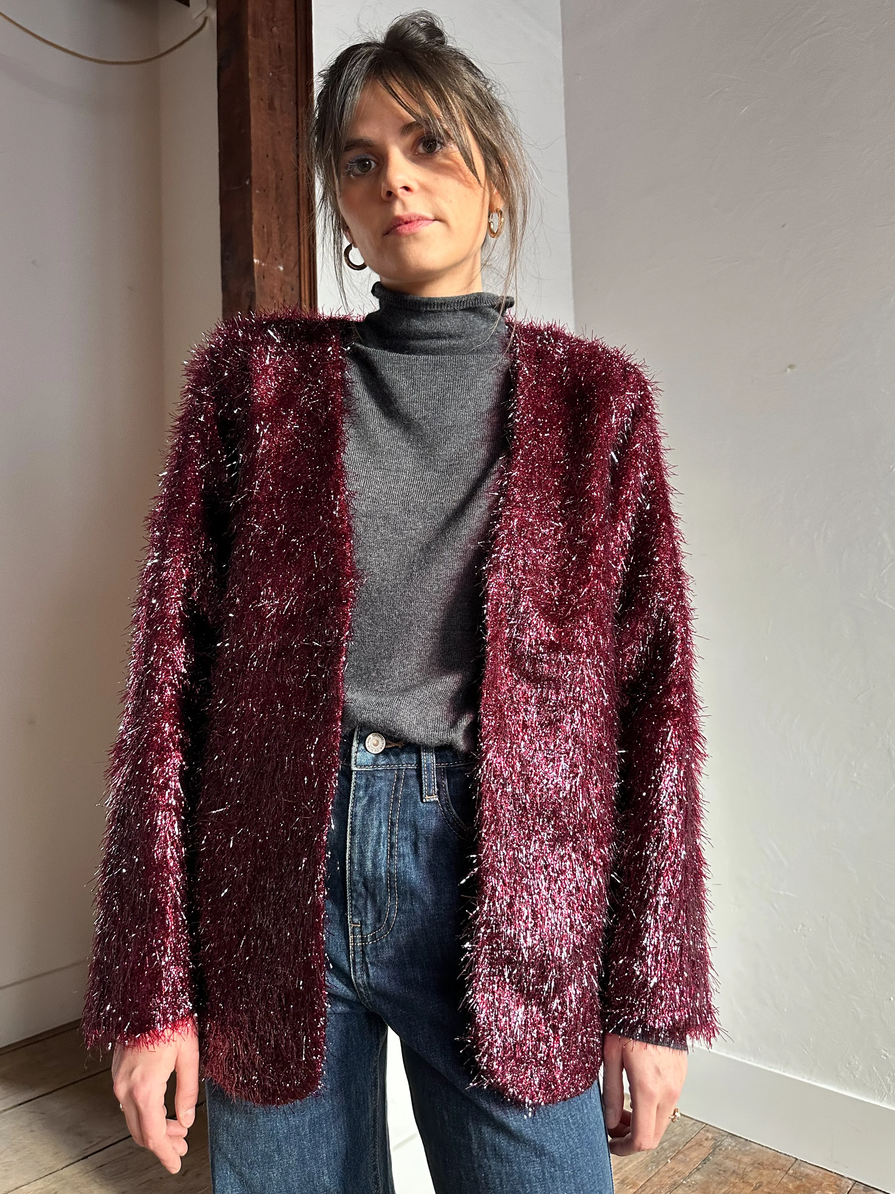Osez l'extravagance subtile avec la veste à poils brillants JEANNE. Sa texture façon fourrure lumineuse est rehaussée par une couleur prune profonde et chic, parfaite pour illuminer vos tenues de soirée ou d'hiver. Cette pièce combine audace et structure pour un look mémorable !